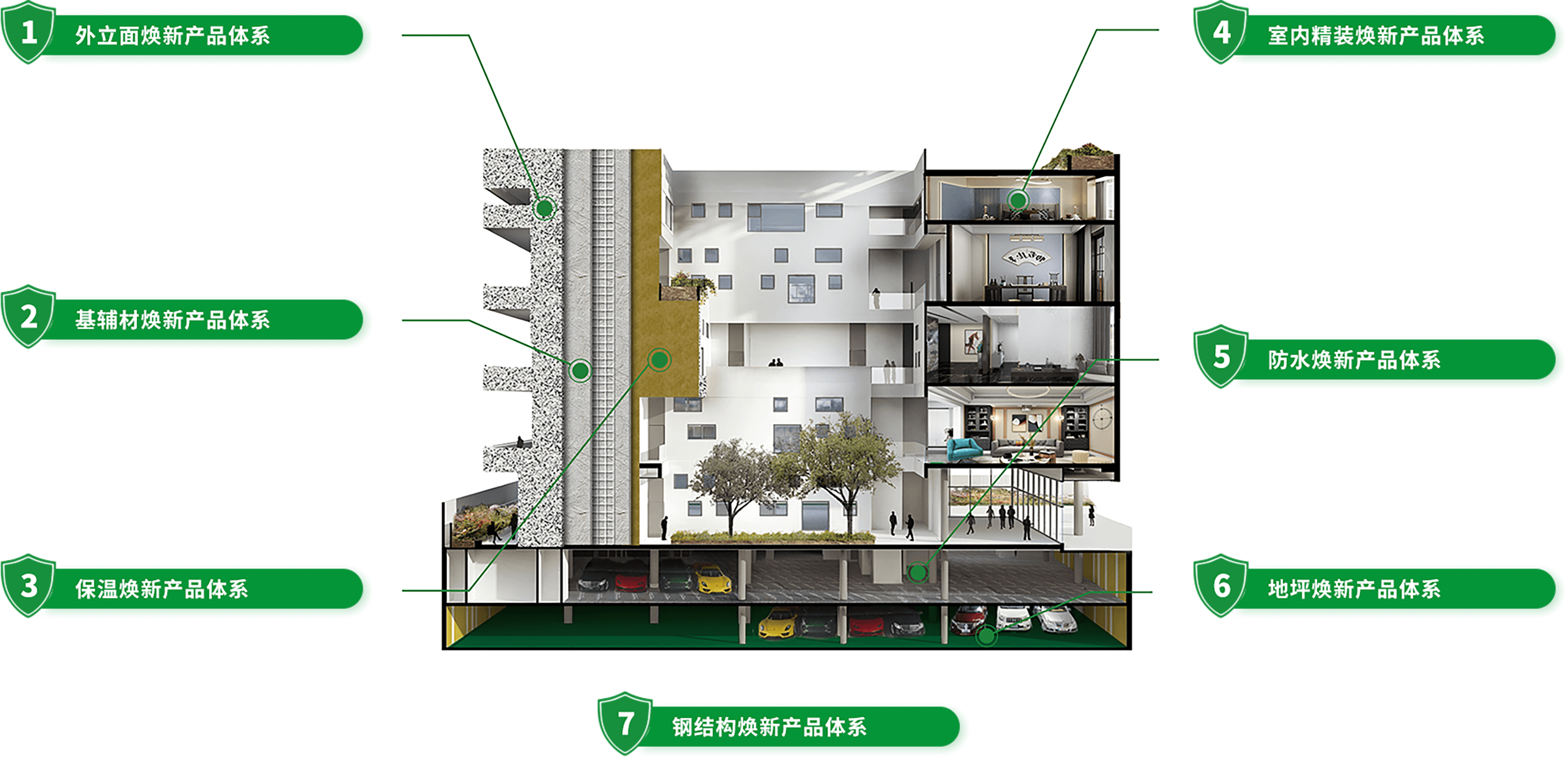 基于三棵樹工程“七位一體”產品體系構建了綠色、節能、低碳的城市煥新渠道產品體系,并持續升級,滿足日益增長的行業環保需求與可持續發展目標。